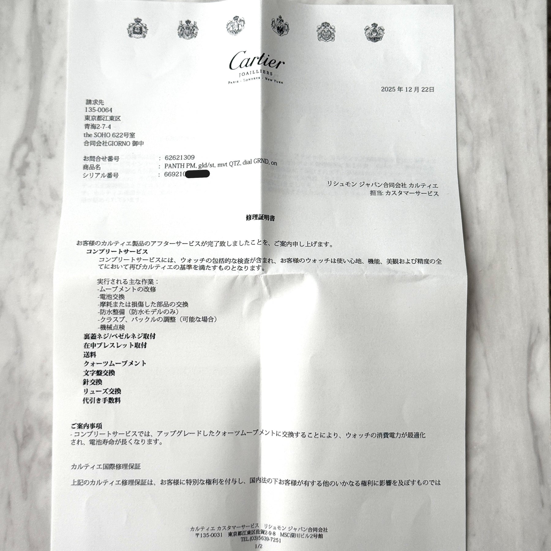 ※カルティエのコンプリートサービスを受けた時計は、修理明細書の日付より2年間カルティエの保証が受けられます。