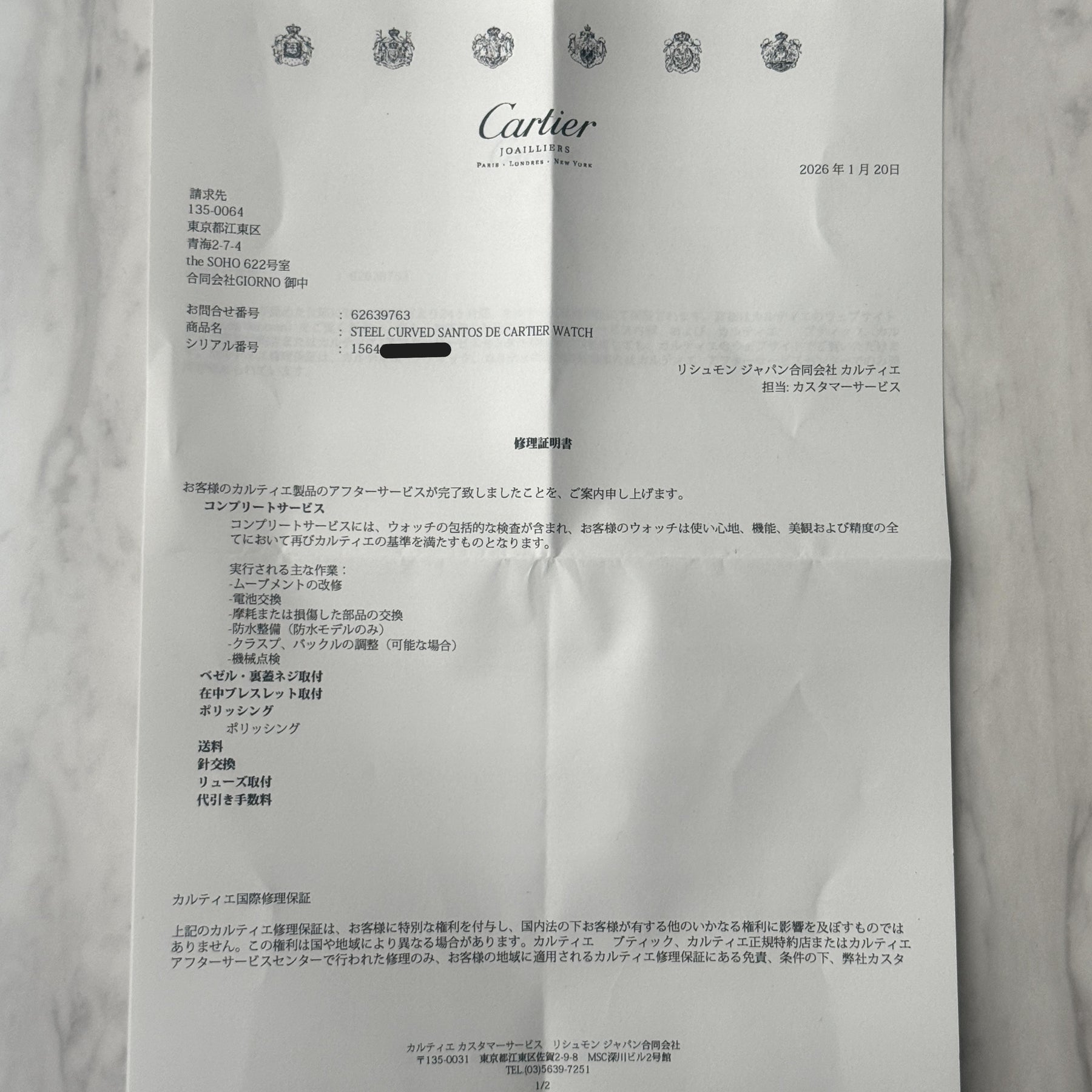 ※カルティエのコンプリートサービスを受けた時計は、修理明細書の日付より2年間カルティエの保証が受けられます。
