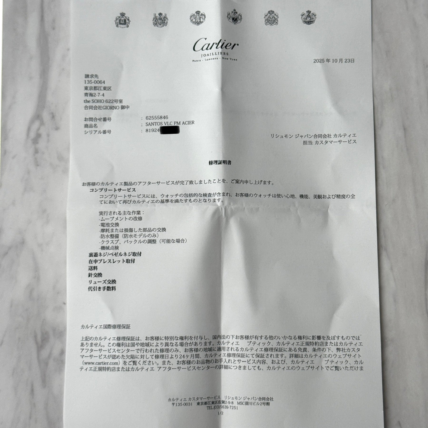※カルティエのコンプリートサービスを受けた時計は、修理明細書の日付より2年間カルティエの保証が受けられます。