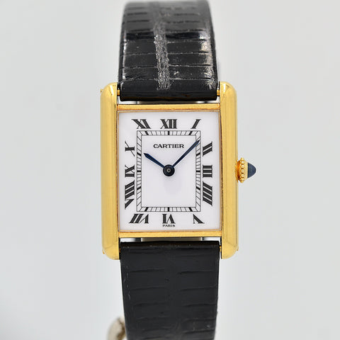 The details unique to the Tank Louis Cartier hand-wound model can be seen,
