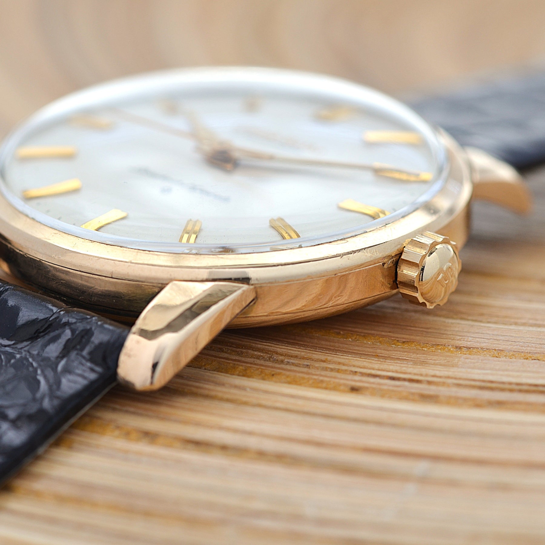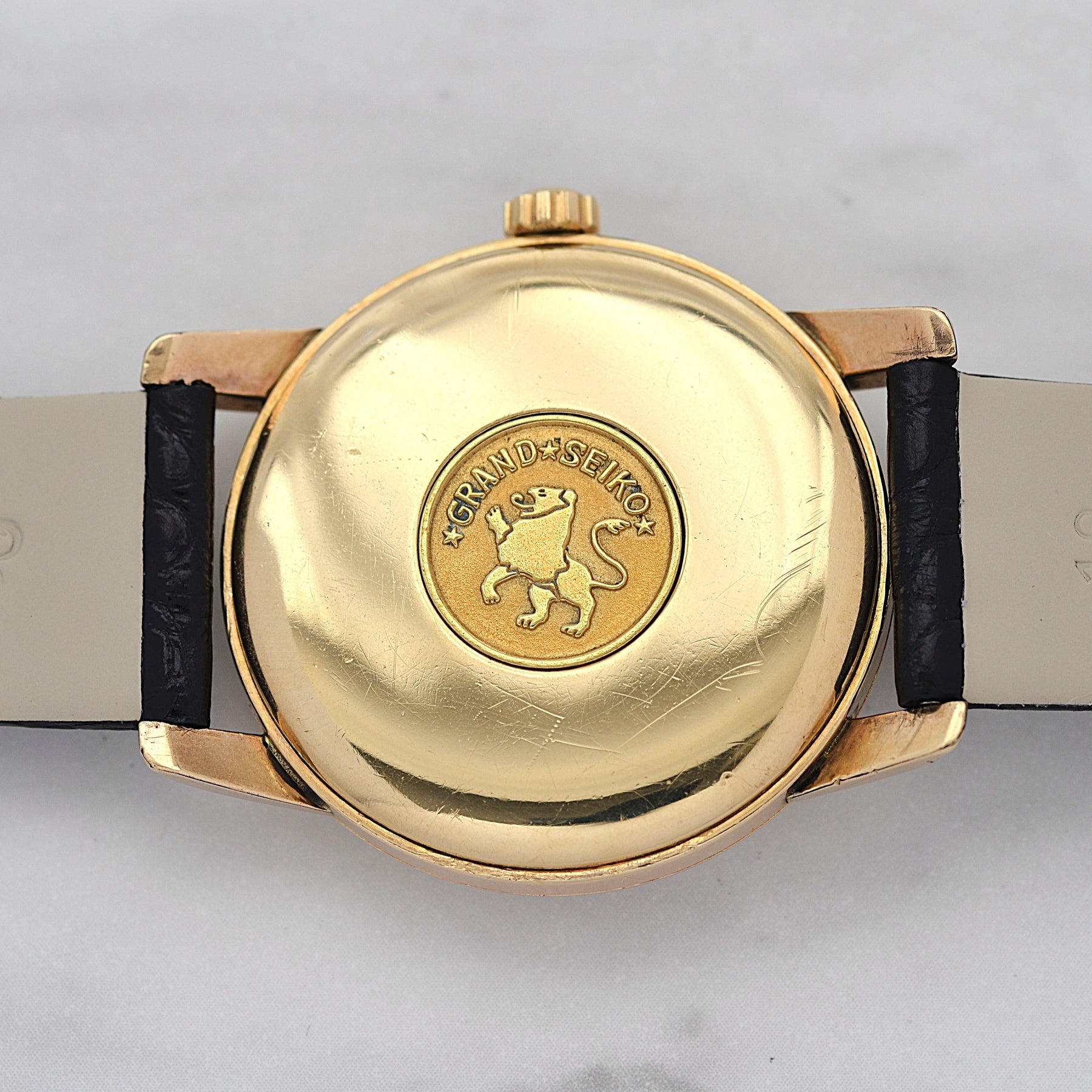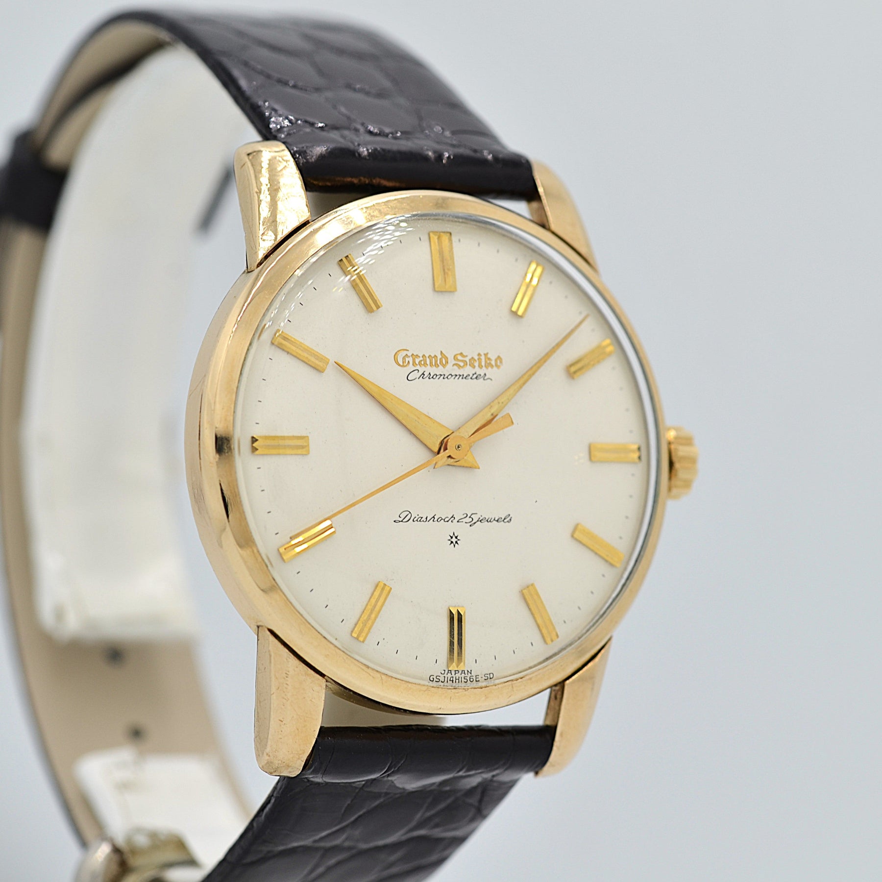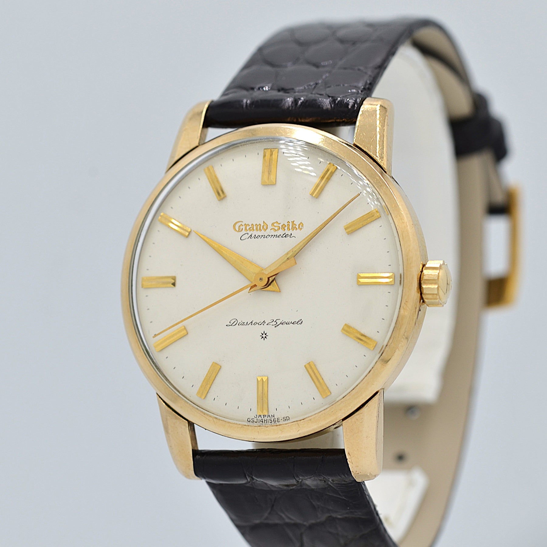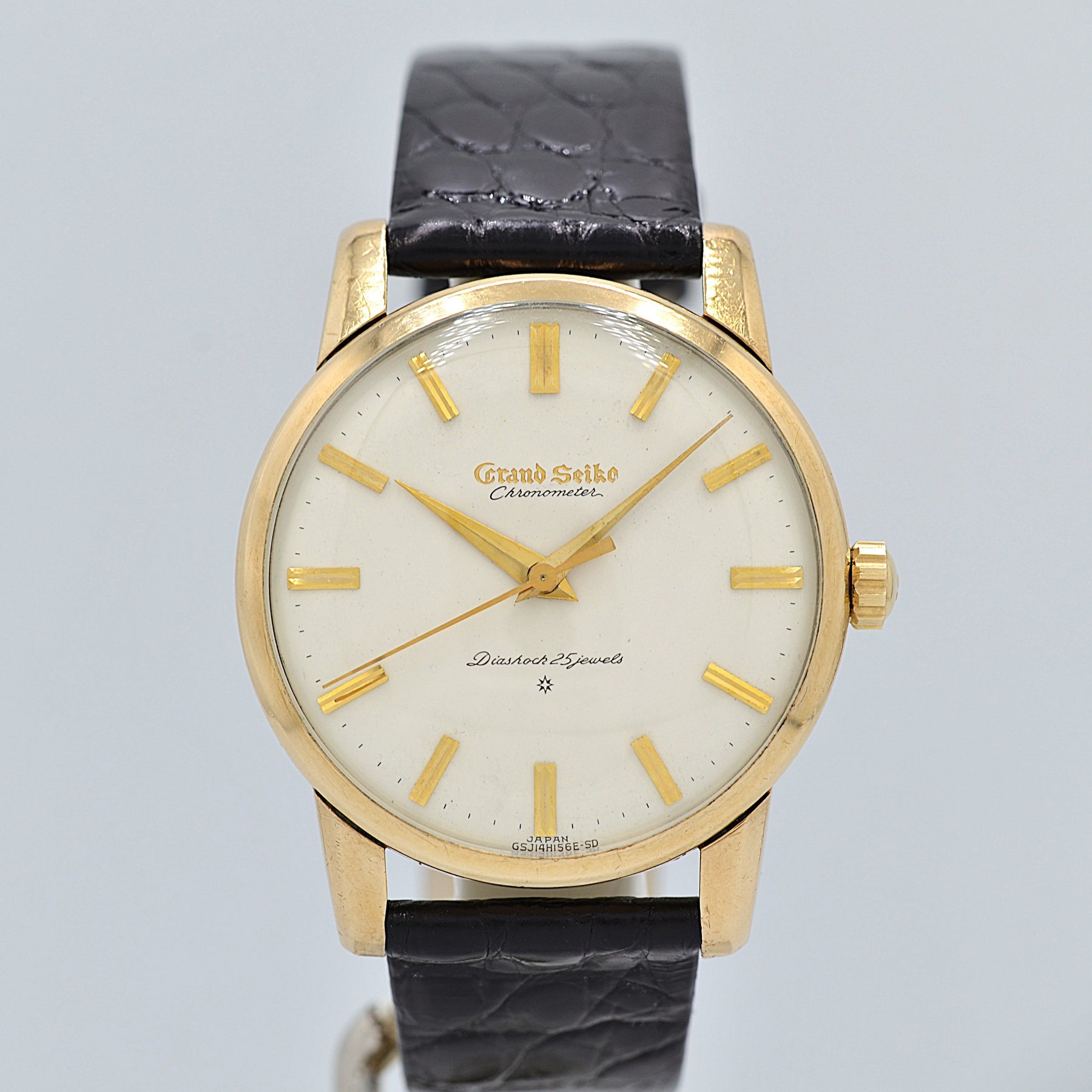 The engraved dial, produced until mid-1961, features an intricate detail with the Grand Seiko logo carved into the dial.