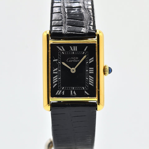 カルティエでは珍しいブラックカラーの文字盤が目を惹く存在です。