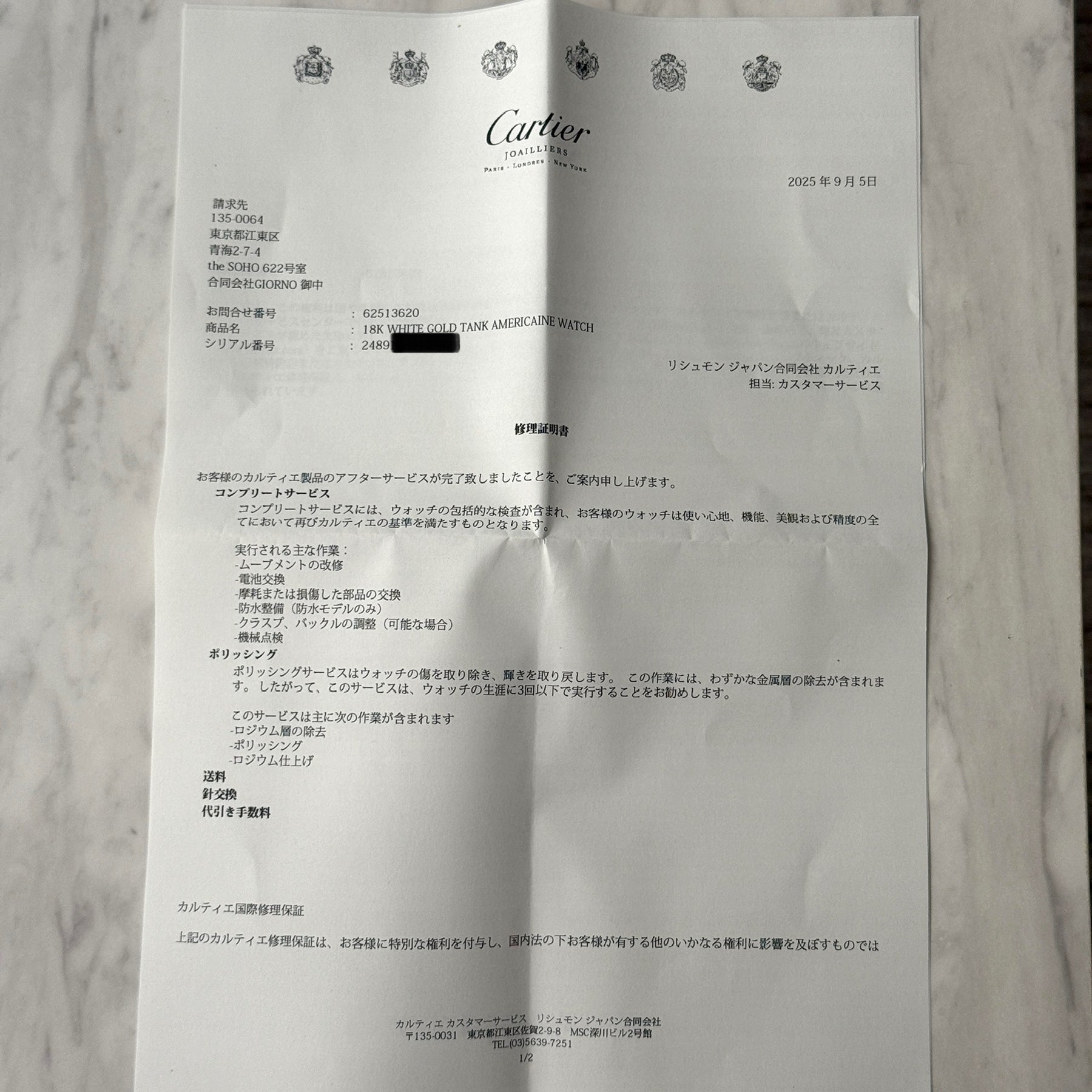 商品をお渡しの際にカルティエの修理明細書(A4用紙の原本)もお渡しいたします。